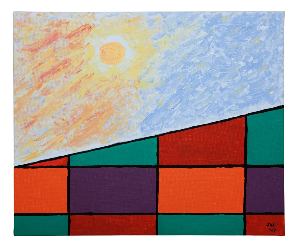 The image is separated in two halves by a black line, presumably “arbetslinjen” (“the line of work” in swedish). Above the line there is blue sky and a sunset or a dawn. Under the line there are coloured squares. Most of them are red or green which also are the colours of the swedish opposition. The painting also has a tagline, The work strategy: what separates the squared, controlled from the free, the empowerment. (Arbetslinjen: Det som skiljer det inrutade, kontrollerade från det fria, från egenmakten).