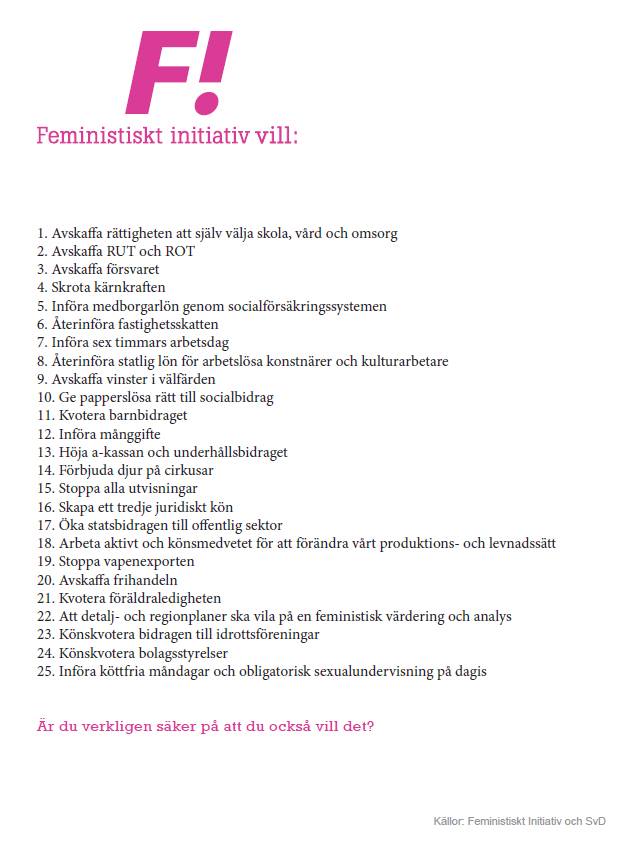 Bilden ovan har gjorts av någon som vill ge Feministiskt initiativ negativ uppmärksamhet. Precis som den gången då Moderata ungdomsförbundet gjorde en riktigt bra kampanj åt Vänsterpartiet undrar jag om denne någon vet vad hen sysslar med. Är det någon av Fi:s potentiella väljare som kommer att hitta något problem med ovanstående lista? Är du verkligen säker på att du också vill det? Japp.
