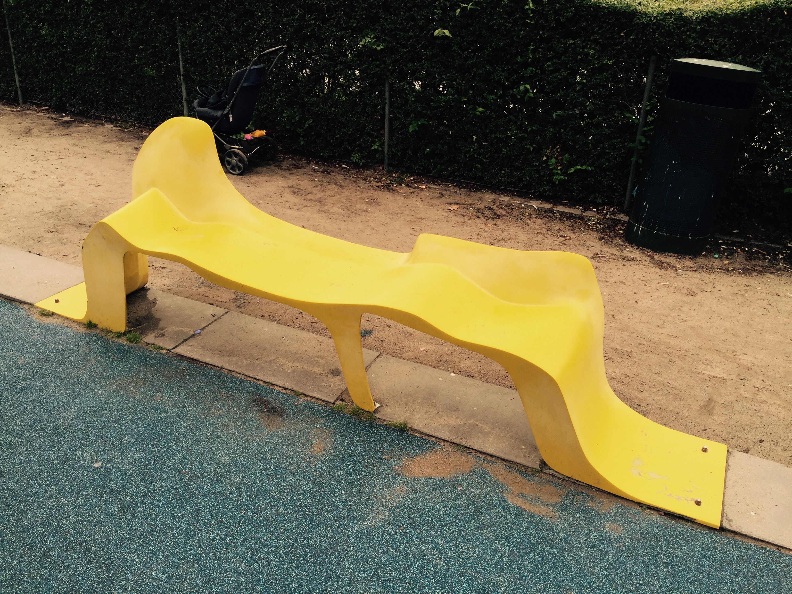 Bänken på bilden påminner en del om Camden-bänken, med sin ojämna ovansida. Men eftersom den är placerad på en lekplats uppfattar jag den snarast som roligt utformad och anpassad till sin omgivning är som ett exempel på exkluderande design. Trots att den alltså har ungefär samma utformning som det kanske mest utstuderade exkluderande objektet människan skapat hittills.