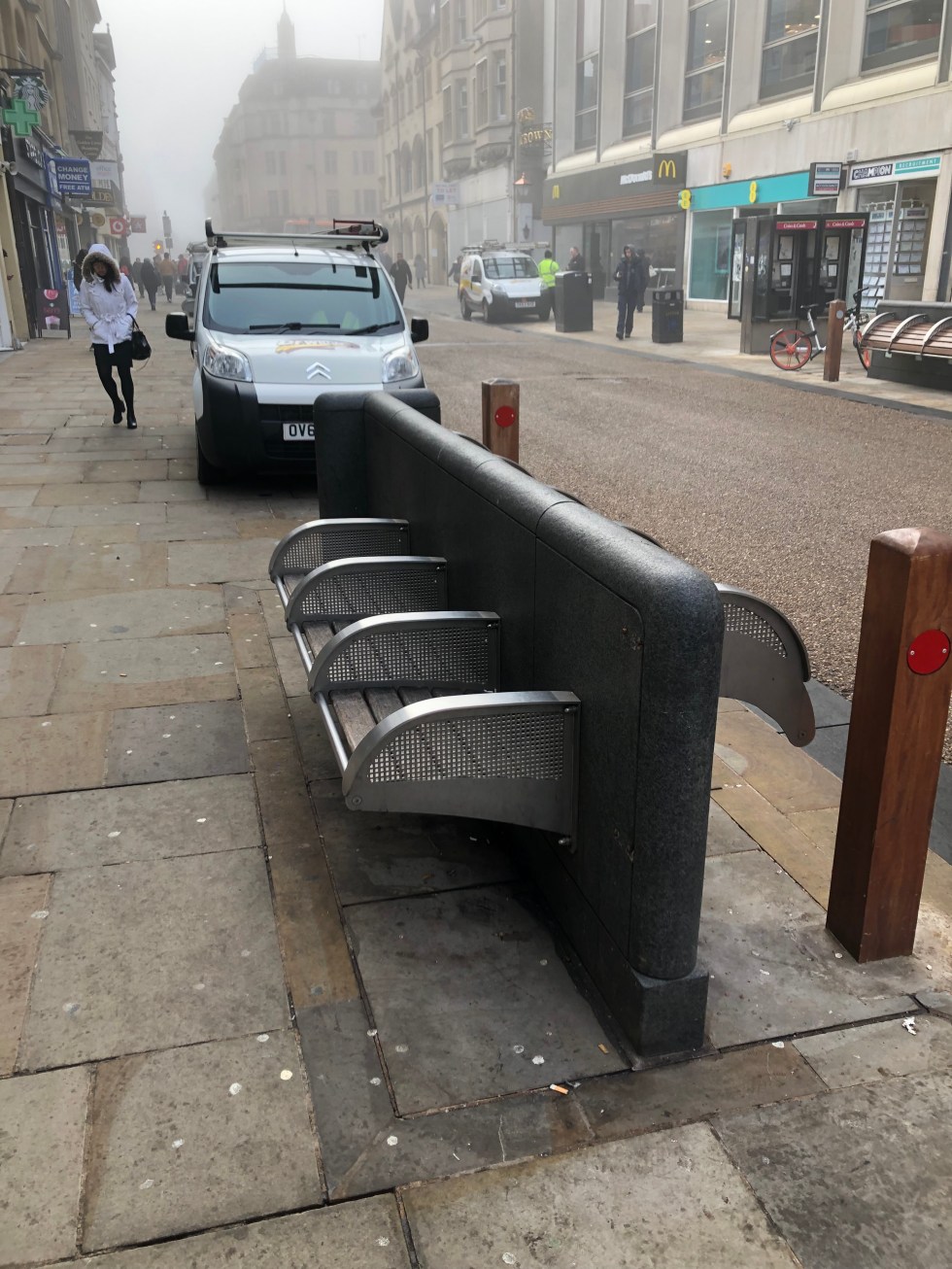Är på besök i Oxford. Här i centrala delen av staden sover bara turister, riktigt jäkla rika och riktigt jäkla fattiga. De sistnämnda utomhus. Givetvis inte på de här bänkarna
