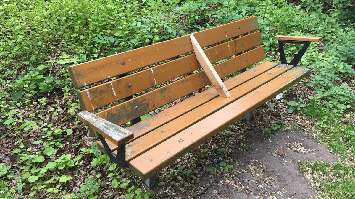 Signaturen Glasskamp tog den här bilden på en bänk i Tora Dahls park. Flera av bänkarna, som hemlösa då och då använder för att sova på, har försetts med liknande hinder.