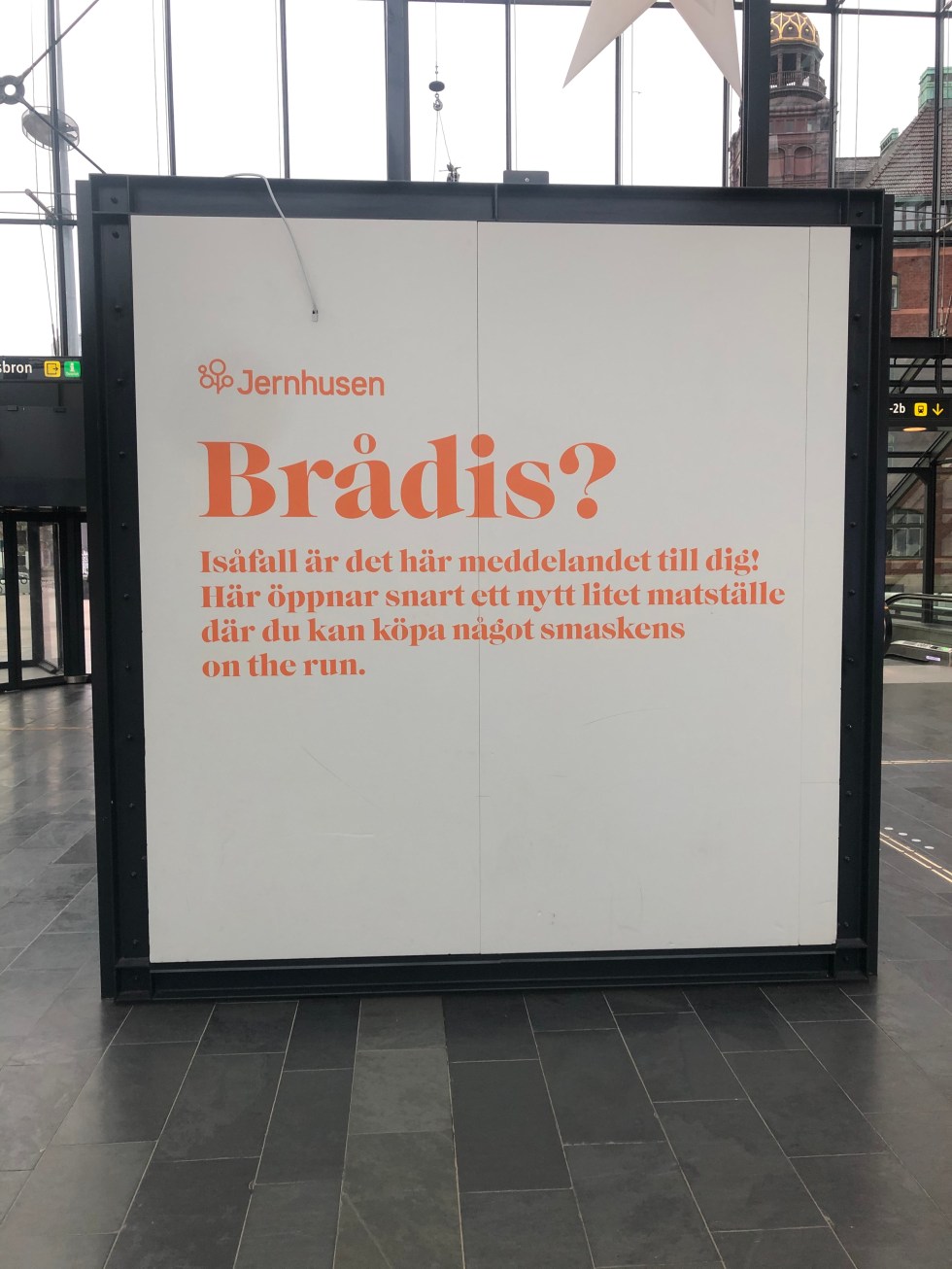 Den här typen av normerande uppmaningar är vanligt förekommande på stationen. Reklamskyltar kallar dig ”Speedy Gonzales” och frågar om du har ”brådis”. Då och då dyker det upp en pop-up-butik som säljer enportionsförpackningar tänkta för mikrougnen.