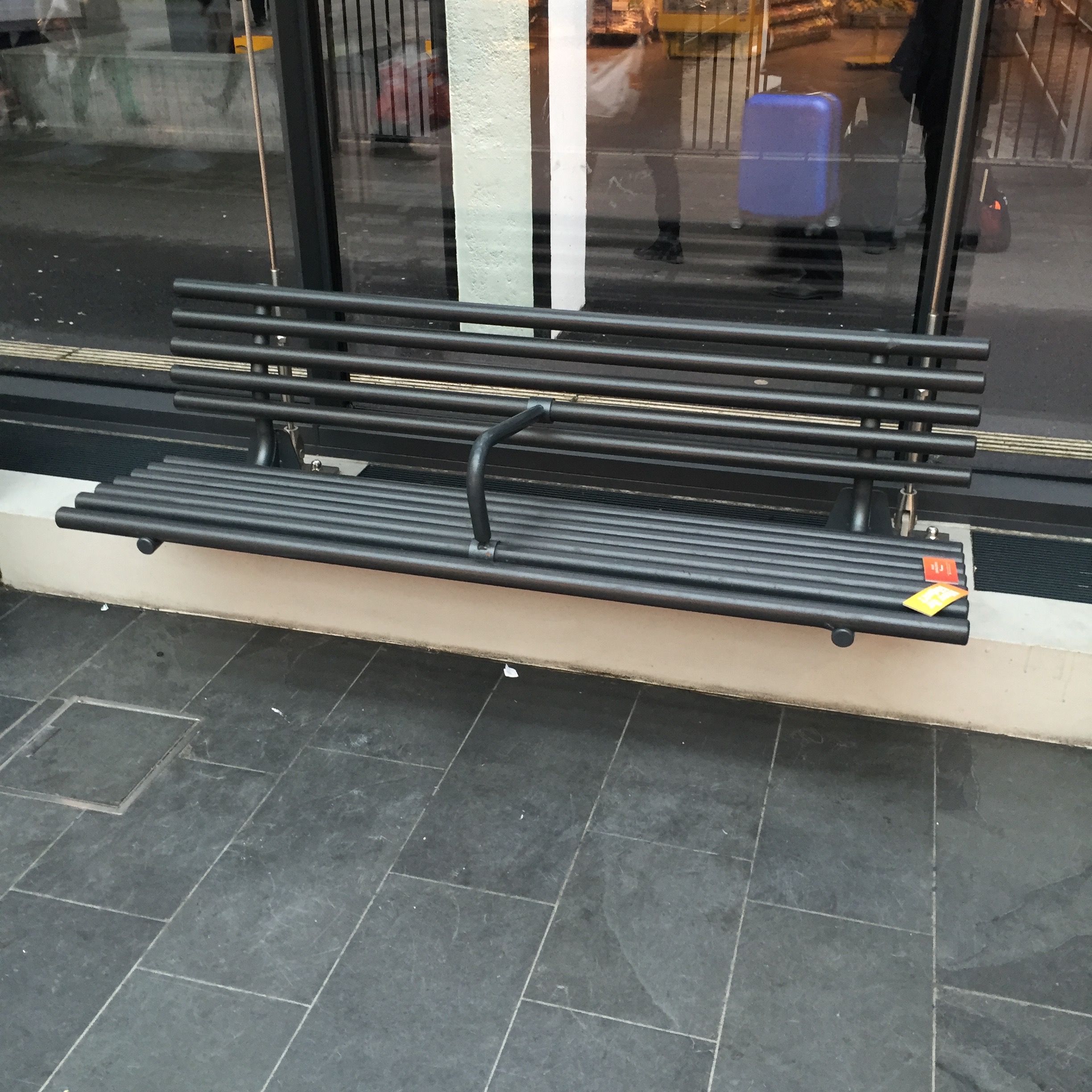 Men även stationens arkitektur inbjuder till rörelse. Restaurangerna har få riktiga sittplatser. Vissa av dem är dessutom placerade i den gång där människor som ska till och från tåg och bussar passerar. Det förekommer också flera sorters exkluderande design (Edin 2014, 2017), som bänkar det inte går att ligga på. I vissa fall går det inte ens att sitta på utan bara luta sig med lätt böjda ben.