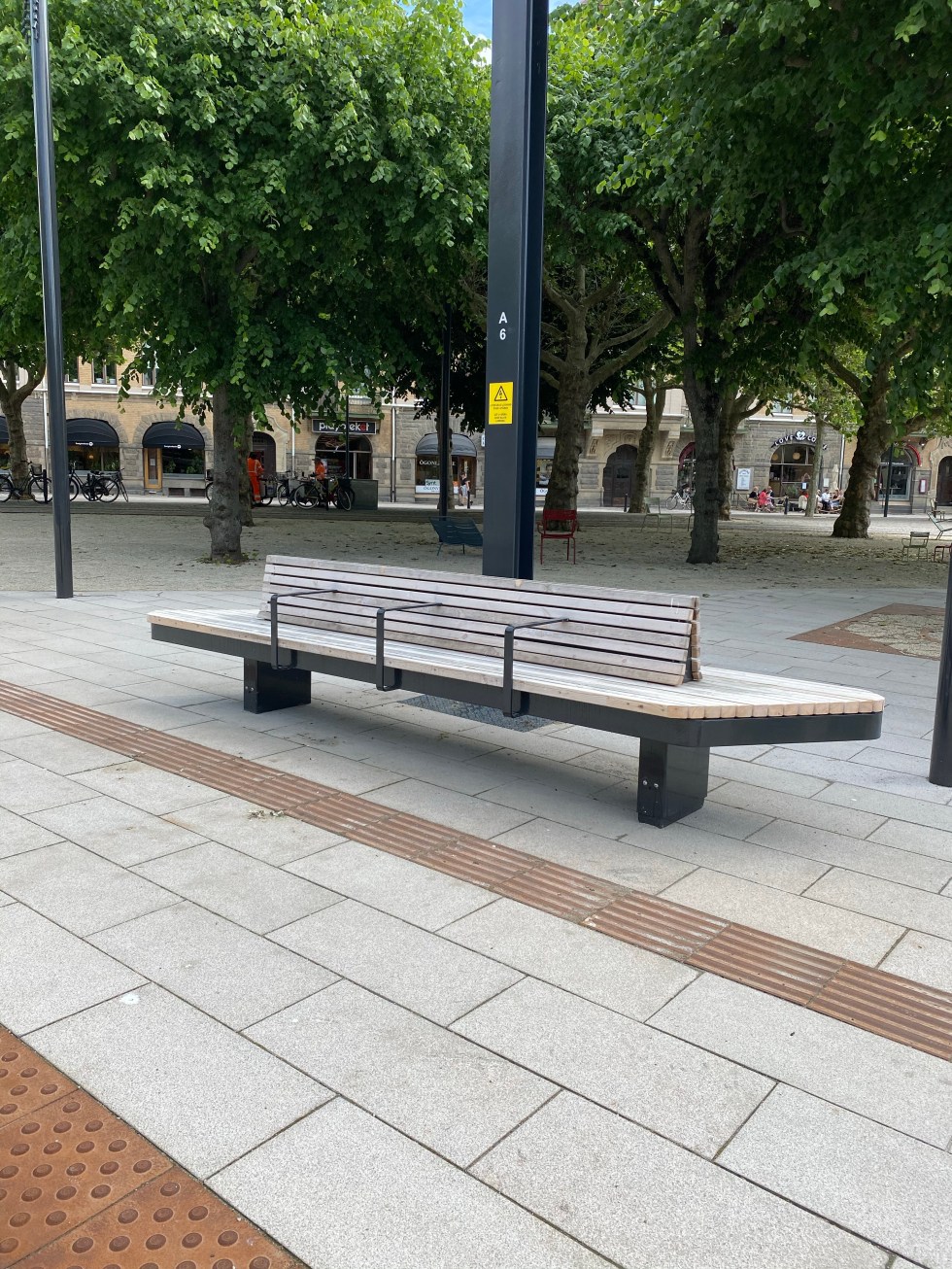 Clemenstorget i Lund har rustats upp, delvis på grund av den nya spårvagnsstationen. Bänkarna är av två olika exkluderande slag, dels med ryggstöd i mitten och dels såna där man bara kan luta sig emot.