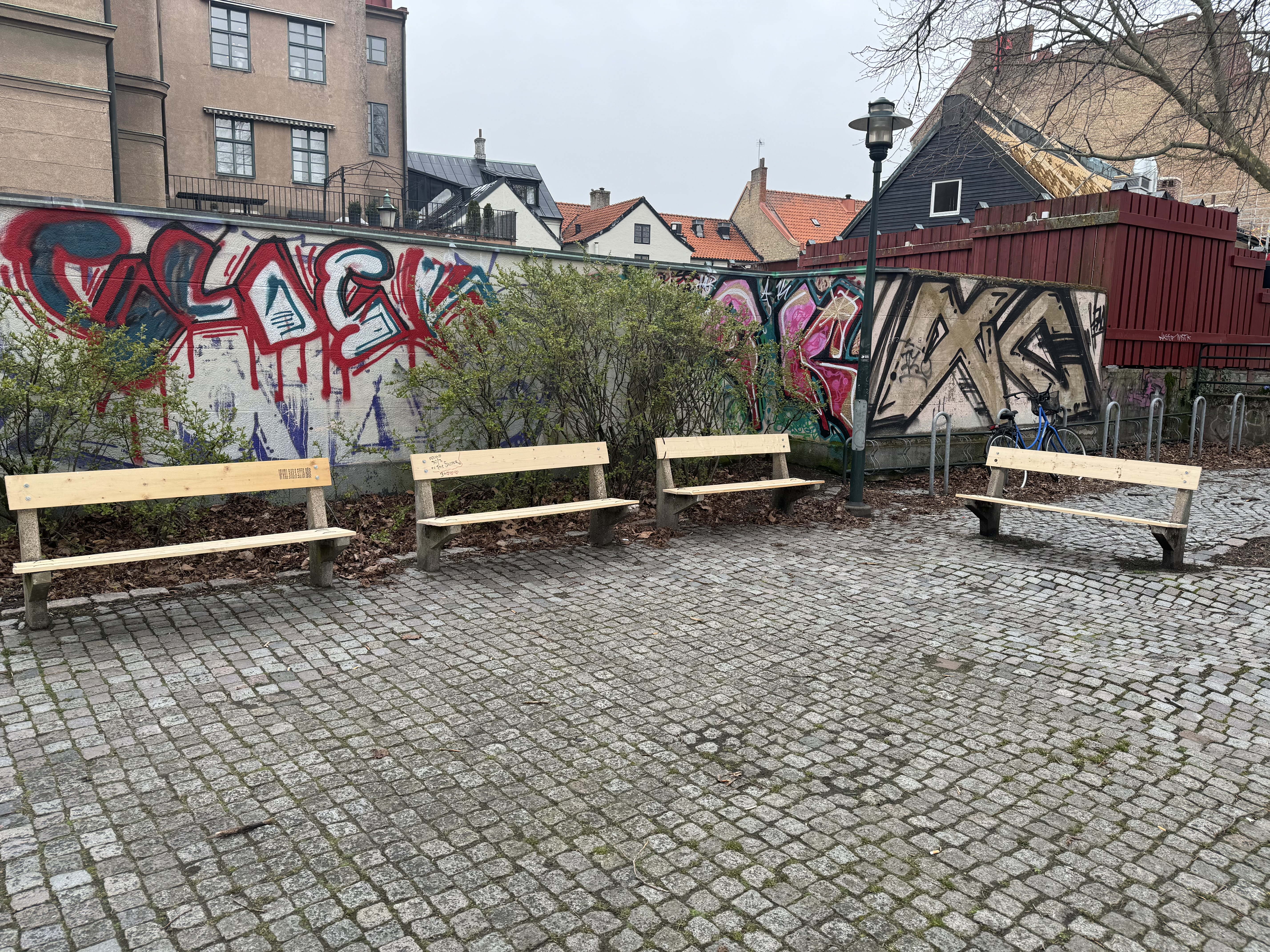 Mathias Kristersson tyckte det saknades bänkar vid en öppen plats på Värnhem i Malmö, så han tillverkade egna, målade dem i ”kommunalgrönt” och ställde ut dem.